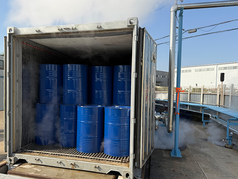 新設備はリーファーコンテナを改造した構造で、約60ドラムの同時加温が可能です。